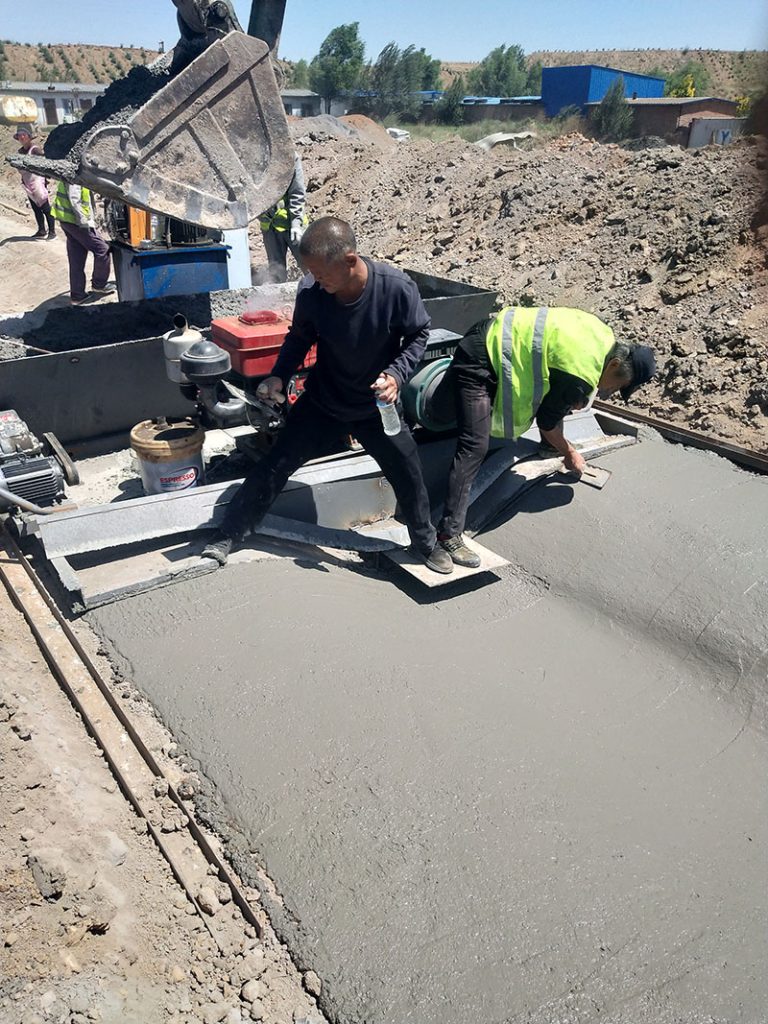 今天分享這臺自走式水渠機的案例有兩大特點。眾所周知在前些年的技術文章里我一直強調過自走式液壓水渠機不可以使用商混料。而今天這臺山西朔州的液壓水渠機恰恰是使用罐車商混料,而且做的很成功。近些年水溝現澆的工程中對混凝土的要求是越來越高了。就如此次朔州的這個現場,甲方明確要求必須使用標號C25的商混。